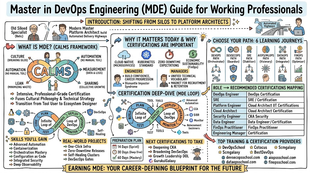 Earning your Master in DevOps Engineering (MDE) is a career-defining move. In an industry that aggressively rewards those who can bridge the gap between “code” and “scale,” this certification is your architectural blueprint for the future. By choosing a reputable partner like DevOpsSchool and committing to hands-on mastery, you aren’t just obtaining a certificate—you are future-proofing your career in the global cloud economy. Now is the time to transition from an administrator to a high-value Platform Architect.