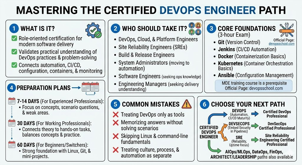 | Master in DevOps Engineering (MDE) | DevOps / Leadership | Advanced | Professionals aiming for broader architecture and leadership growth | Prior DevOps exposure and delivery experience | Advanced DevOps, wider engineering depth, platform and transformation thinking | After DSOCP for broader growth |
